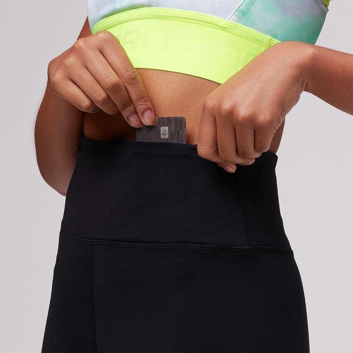 - Hidden waistband pocket stashes your card and keys